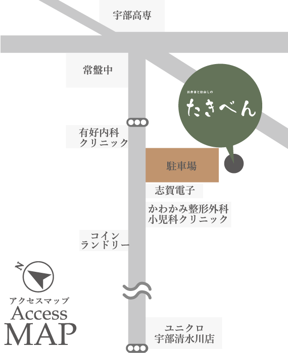 常盤中・宇部高専の五差路交差点からユニクロ方面に約400メートル進むと信号があり、道路右側には有好内科クリニック・よつば薬局があります。左前方に「志賀電子」と記された建物、すぐ手前に駐車場があります。この駐車場に入ってください。つきあたりまで行くと専用駐車スペースがあります。